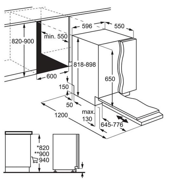 | Габариты ниши (ВхШхГ) | 820-900х600х550 мм |