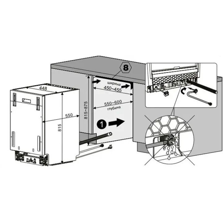 | Габариты встраивания (ШхГхВ) | 450-455х550-600х815-875 мм |